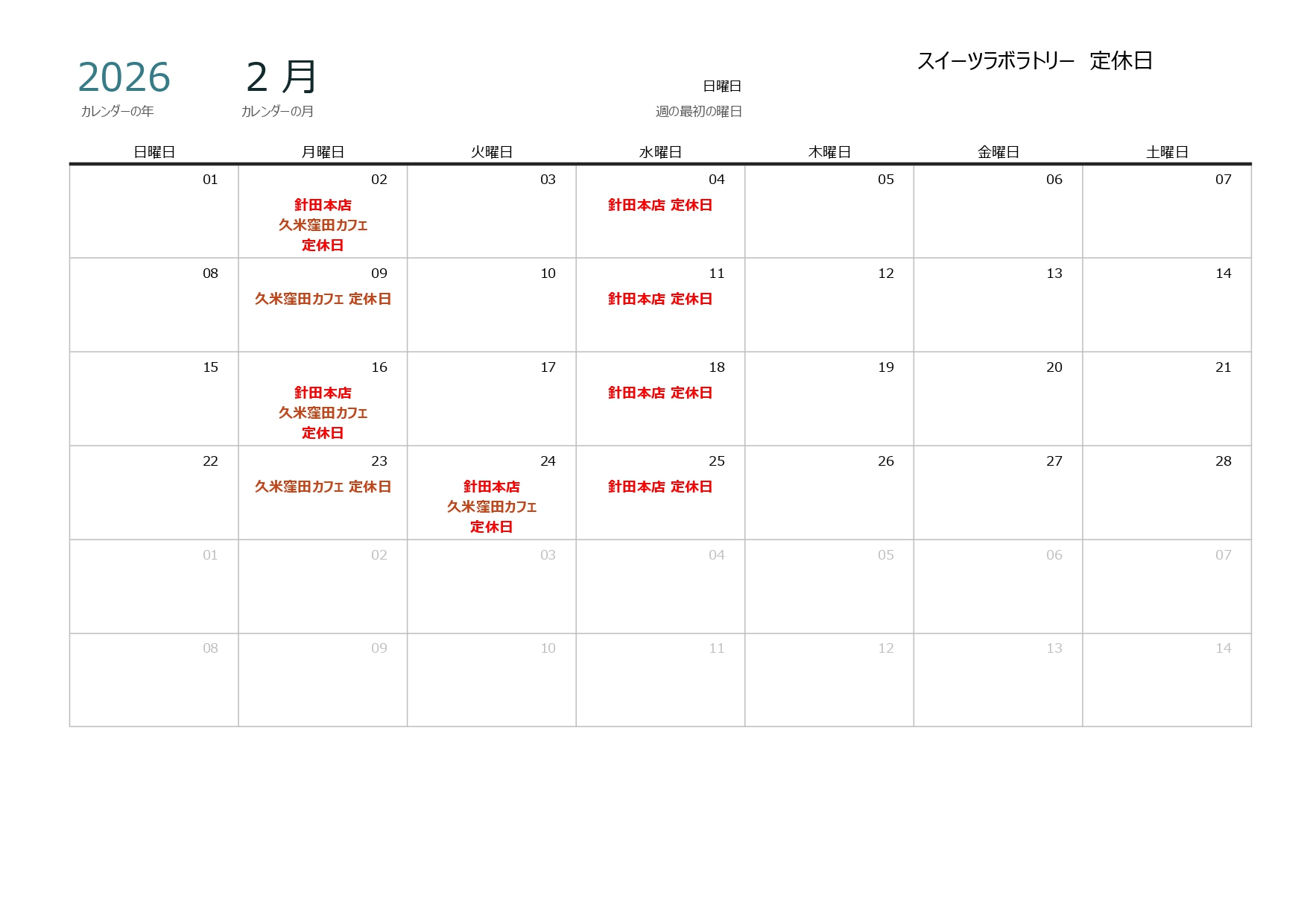 2026年 2月 定休日のお知らせ